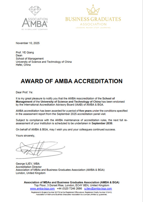 2025年11月10日,中国科学技术大学管理学院正式收到英国工商管理硕士协会(Association of MBAs,简称AMBA)的贺信,宣布学院成功通过AMBA 2025年再认证,再次获得五年最高期限。此次认证是学院继2016年获得AMBA认证、2020年首次通过再认证之后,第三次通过该项认证。