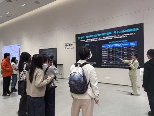 AI医疗展区呈现了技术温度与商业潜力的双重奏。讯飞晓医的健康检测、AI辅助诊断系统的精准分析、医疗数据的智能化管理,不仅揭示了AI在医疗健康领域的广泛应用前景,也激发了同学们对大健康产业新机遇的思考。大家围绕AI医疗的商业模式、伦理边界与市场前景展开探讨,结合自身行业经验,分析其在医疗供应链、健康管理服务等环节的可能路径,让课堂所学更贴近实战。